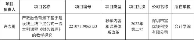 本网讯 近日,教育部高等教育司公布2022年第二批产学合作协同育人项目立项名单,亚博取款许志勇副教授“产教融合背景下基于建设线上线下混合式一流本科课程《财务管理》的教学探究”项目获批立项。