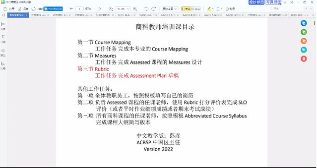 本次培训由协助专业认证的许冰清老师讲解,培训主要讲解认证指标中的“Rubrics”板块。培训开设主讲人介绍了量规的种类、特点、设计的常规方法等。Rubric指量规打分评价表格,用于对学生特定的一项具体工作成果进行细项打分评价,主要用于评价学生能力培养目标。包括对于学生在具体一项工作中的表现或者一项具体工作成果。量规可以辅助教学,量规编制和选择的依据是学生学习的评估标准,聚焦学生学习比聚焦教学更能真正促进教学。虽然教学内容是明确的,但是没有明晰的教学成果。如果教学成果模糊,就很难实现教学内容的有的放矢。而量规恰恰能够弥补这一漏洞,从教学内容和教学成果两个方面进行界定。良好的量规能够帮助教师将任务、活动与学习目标区分开,明确任务的完成或活动的结束并不等于学习目标的达成。确保教师教学以标准为中心,而不是以任务为中心。量规可以借鉴美国高校协会公布的SLO(Student Learning Outcomes)学生专业能力培养评价。会议最后,几位老师就疑问和主讲人进行了交流。