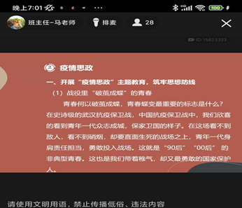 其中会计智能2141班马苗苗老师发表了战役里“破茧成蝶”的青春的主题讲话。马苗苗老师表示:青春何以破茧成蝶,青春蝶变最重要的标志是什么?在史诗级的武汉抗疫保卫战,中国抗疫保卫战中,我们欣喜的看到青年一代众志成城,保家卫国的样子。青春抗疫,你我同行。在这场看不到敌人,看不到硝烟,却要直面生死的战场之上,青年一代身肩责任担当,勇敢投入战场。青春是破茧成蝶的故事,青春就是担当。她希望全班同学都能成为有理想、有担当的青年一代。