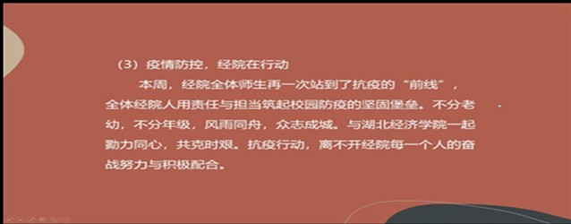 会计1941班黄海燕老师则在本次晚讲评中强调:疫情防控,经院在行动。黄老师为本班学生展示了过去一周经院的抗疫事迹。本周,经院全体师生再一次站到了抗疫的“前线”,全体经院人用责任与担当筑起校园防疫的坚固堡垒。与亚博取款出账秒到一起勠力同心,共克时艰。抗疫行动,离不开经院每一个人的奋战努力与积极配合。正是因为每个人的不懈努力和团结一心,我校疫情才得以有效控制疫情。