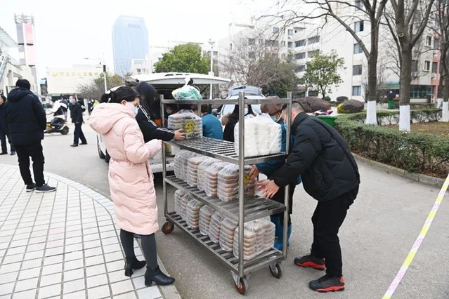 封控后,封控楼栋的每一份饭都离不开老师和志愿者的无数趟往返搬运,离不开每一位同学的积极配合。