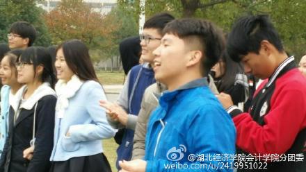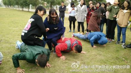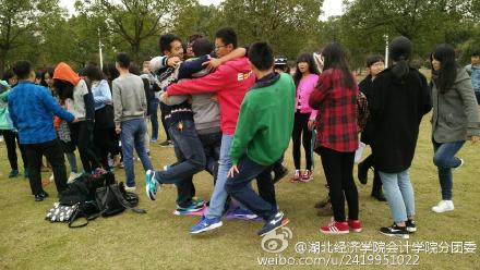 第二个游戏是“拉紧我别松手”,即8个人站在三张卡纸上,然后每轮减少一张卡纸,人数不变,坚持站立最久者获胜。卡纸缩减到一张的时候大家紧紧抱在一起手拉手,齐心协力不断调整排位最终完成了这看似不可能完成的任务。最后一个游戏是“吹大风”掀起活动高潮。实质为抢排位赛,没抢到排位者接受惩罚。输者被处罚时笑料百出,现场笑声不断,给寒冷的空气增添了一份温暖。