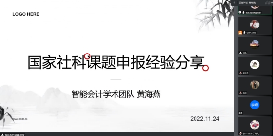 2022年11月24日下午13:00,中心智能会计理论与实务学术团队在腾讯会议开展了学术交流活动,团队成员黄海燕博士做了“国家社科课题申报经验分享”的主题报告,团队全体成员参会,活动由团队负责人刘迅教授主持。