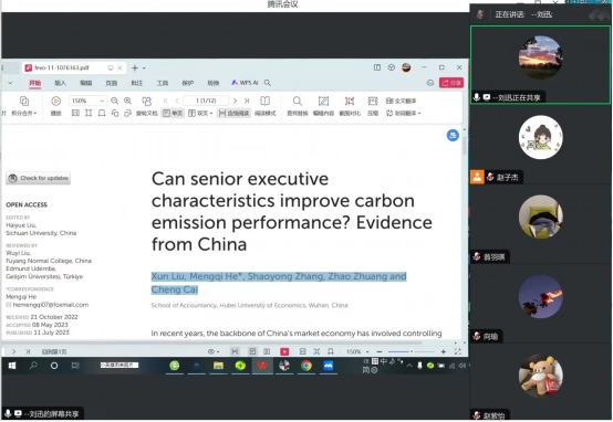 会上,团队负责人刘迅教授分享了他最新研究成果“Can senior executive characteristics improve carbon emission performance? Evidence from China”。刘教授重点分享了他写作过程中对企业高管和碳高排放量企业的样本选择,对建立多元线性回归方程模型的变量和考虑因素,以及对所选样本的统计分析与研究,同时还分享了论文写作、投稿及多轮修改的心得。与会的研究员和研究生进行了热烈的讨论,气氛活跃。