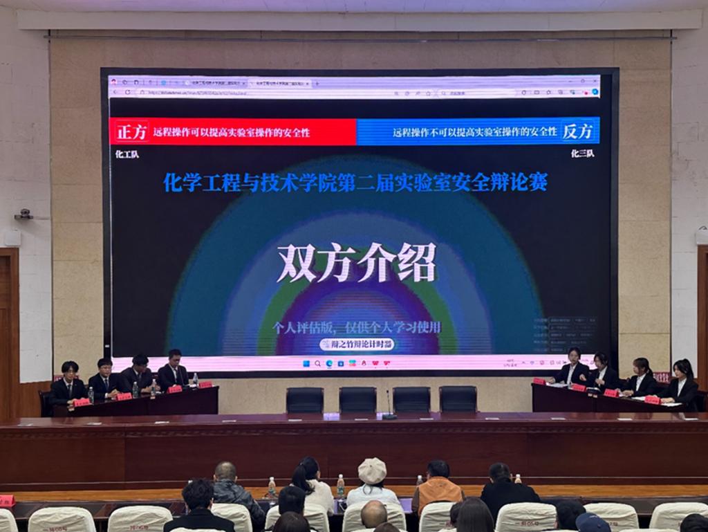 共有化一队、化三队、应化队和化工队四支队伍参加辩论赛半决赛和决赛,比赛分两场进行。第一场是由化一队和应化队以实验室安全应该通过定期的模拟演练来提高,还是更注重实际操作为辩题正方强调定期的模拟演练可以提高实验室安全性的关键,反方则以设备故障的突发性和不可预测性为切入点,阐述了设备实验技能的重要性。第二场是由化三队和化工队以远程操作能否提高实验室安全性为主题,正方认为实验室安全以人为本,远程操作避免人员伤亡,反方则力陈远程操作的不切实际。两场辩论赛过程中,双方辩手唇枪舌剑、你来我往,现场气氛热烈,掌声不断。