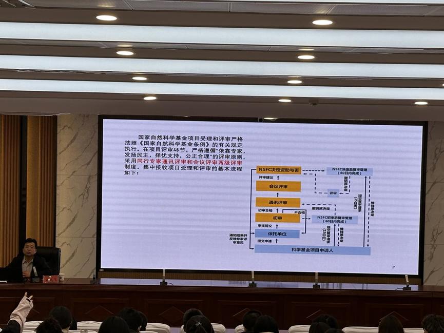 报告会上,宋鹏飞教授结合自身国家自然科学基金申报与评审经验,剖析了基金申报关键环节。他指出选题应紧扣国家重大需求与地方特色,实现创新性、价值性与可行性有机统一,强化研究基础与创新性的深度融合。系统讲解了立项依据的凝练、科学问题的聚焦、创新点的突出以及研究方案的设计等关键内容,强调需注重逻辑架构的严谨性、表述的规范性,避免常见误区。最后,宋鹏飞以“春去了,花开了,当你沉思在往年秋天是否有项目收获时,春又来了,花会再开,我们期待明年的秋天有所收获”寄语师生,勉励大家把握申报时机,力争佳绩。
